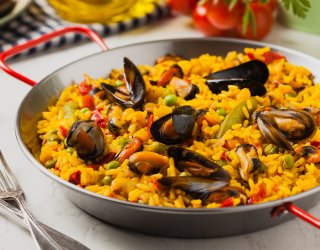 Hiszpańska paella z owocami morza to pyszne i barwne danie z ryżu, wypełnione...