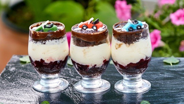 Ciemny biszkopt nasączony odrobiną wiśniówki, do tego polewa czekoladowa i śmietanowy krem. Wszystko ozdobione samochodzikami z kolorowej masy cukr...