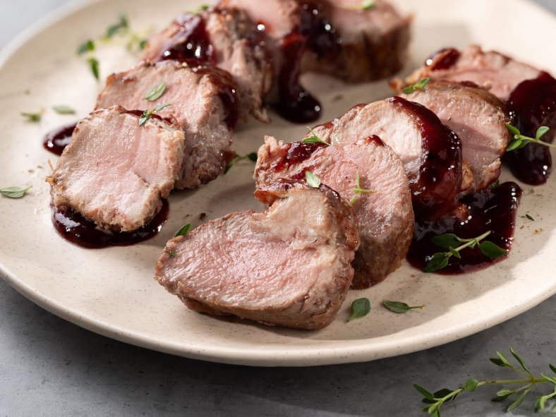 Po upieczeniu mięso odkładamy na 10 minut, by odpoczęło. Sos blendujemy na gładką konsystencję, usuwając gałązki tymianku. Polędwicę kroimy w plastry i polewamy sosem.
