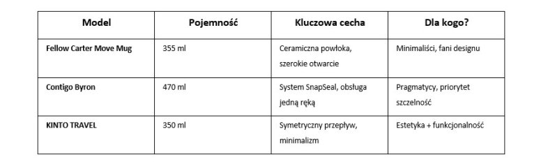 Jeśli priorytetem jest maksymalna szczelność i obsługa jedną ręką, wybierz Contigo Byron 470 ml. System SnapSeal nie zawiedzie, a pojemność wystarczy na długie godziny. Dla fanów designu i naturalnego picia idealny będzie Fellow Carter Move Mug 355 ml z ceramiczną powłoką i elegancką formą.