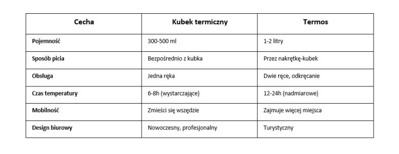 Choć oba utrzymują temperaturę, w biurze kubek termiczny wygrywa. Termos ma większą pojemność (1-2 litry) i utrzymuje ciepło dłużej (do 24h), ale jest cięższy i wymaga nalewania do osobnego kubka. W biurze to niepraktyczne.