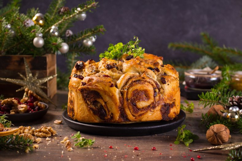 Kiedy ciasto podwoi swoją objętość, wyłóż je na stolnicę, krótko zagnieć i rozwałkuj na prostokąt o grubości około centymetra. Rozsmaruj farsz, zwiń całość w apetyczny rulon i pokrój na plastry szerokie na mniej więcej pięć centymetrów. Ułóż je w natłuszczonej tortownicy i daj im jeszcze chwilę, by urosły. Wstaw do piekarnika nagrzanego do 180°C. Po około 45 minutach wyjmiesz rumiany, pachnący chlebek, który aż prosi się, by podać go z konfiturą z pomarańczy i żurawiny. Na koniec dorzuć gałązkę świeżych ziół. I gotowe!