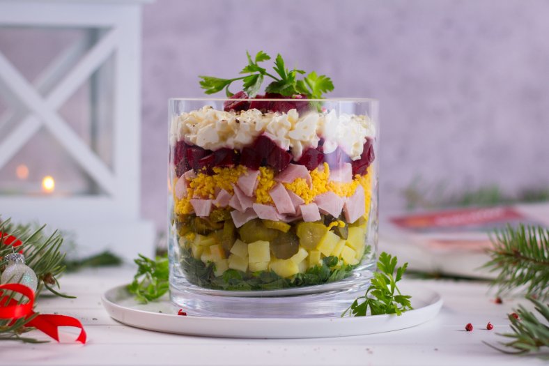 Na rozgrzewkę posiekaj natkę pietruszki. Zostaw kilka ładnych listków na później – przydadzą się do dekoracji. Następnie ugotuj jajka, a po przelaniu zimną wodą i obraniu oddziel je od białek. Zetrzyj na drobnej tarce, a białka wymieszaj z majonezem i szczyptą soli. W międzyczasie pokrój w kostkę ugotowane ziemniaki sałatkowe oraz buraki. Ogórki konserwowe potnij w cienkie plasterki i osusz. Szynkę Basiuni osusz ręcznikiem papierowym, pokrój w krótkie paseczki i przygotuj się do składania całości.
