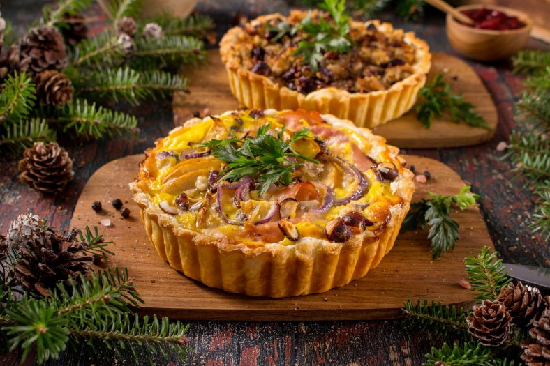 Czas na napełnianie tarty. Układaj na przemian plastry Szynki Jak u Dziadka, cząstki jabłka i piórka cebuli. Zalej całość przygotowaną masą jajeczną, a wierzch obsyp suszoną żurawiną, posiekanymi orzechami laskowymi i tartym parmezanem – te dodatki sprawią, że tarta nabierze świątecznego charakteru. Tak przygotowaną foremkę wstaw do piekarnika rozgrzanego do 220°C. Najpierw piecz przez 10 minut, by ciasto zaczęło się rumienić, a potem przykryj tartę folią aluminiową i zostaw na kolejne 15 minut. Na koniec dodaj odrobinę świeżej natki pietruszki i podaj całość z borówką. Zrobiło się niemal samo, prawda?