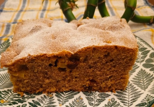 Suche składniki wymieszałem i przesiałem do powstałej mokrej masy. Zmiksowałem i na koniec dodałem kostkę z jabłek mieszając łyżką. Do ciasta dodałem garść rodzynek Przelałem na blaszkę 24x24 cm, piekłem 50 minut w 170 stopniach bez termoobiegu.