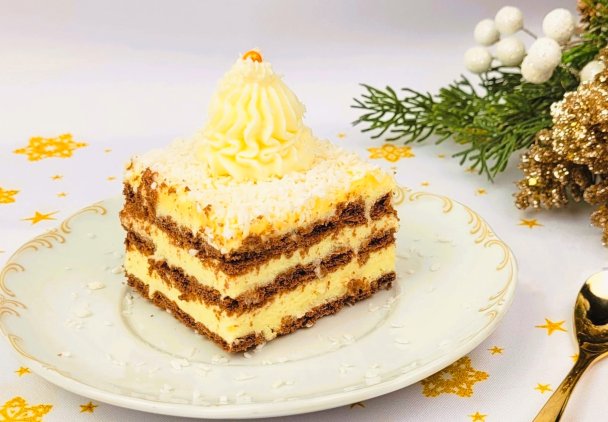 Proste, pyszne ciasto budyniowe z kokosem na ciasteczkach petit beurre, polane białą czekoladą i posypane kokosem. Delicje w sam raz na podwieczorek świąteczny.