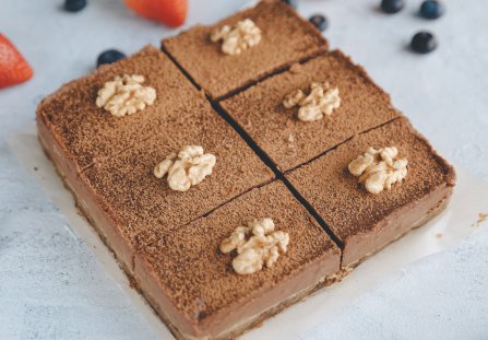 Gotową masę grysikową połącz z posiekanymi orzechami i przelej na spód z herbatników. Ciasto odstaw do przestudzenia. Przed podaniem ciasto na Dzień Babci udekoruj kakao i połówkami orzechów włoskich.