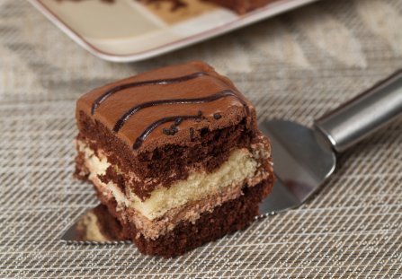 Ciasto Pawełek to dwukolorowy biszkopt przełożony kremem z kultowych batoników czekoladowych.