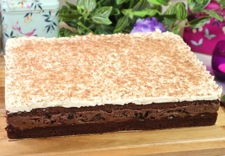 Po nasączeniu biszkoptu wyłóż na niego 200 g lekko kwaskowej konfitury śliwkowej i rozprowadź ją równą warstwą po całej powierzchni ciasta. Następnie wyłóż na nią krem budyniowy i również rozprowadź go równą warstwą po całej powierzchni biszkoptu. Po wyrównaniu warstwy kremu przykryj ją drugim, cieńszym blatem biszkoptowym, i delikatnie dociśnij go do kremu, żeby poszczególne warstwy się ze sobą skleiły. Obficie oblej biszkopt resztą ponczu. Na nasączony drugi blat wyłóż schłodzoną śmietankę z mascarpone i ostrożnie rozprowadź ją równą warstwą po całym wierzchu ciasta. Na końcu oprósz całość startą mleczną czekoladą. Tak przygotowany deser wstaw do lodówki na całą noc, do całkowitego zestalenia kremów i pełnego rozwinięcia smaków.