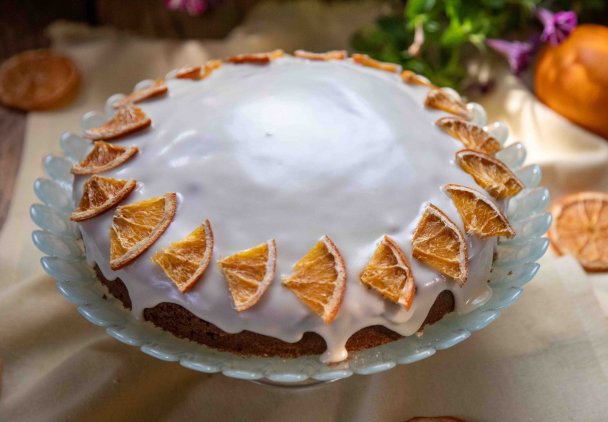 Po wystudzeniu udekorować lukrem i suszonymi plasterkami pomarańczy.