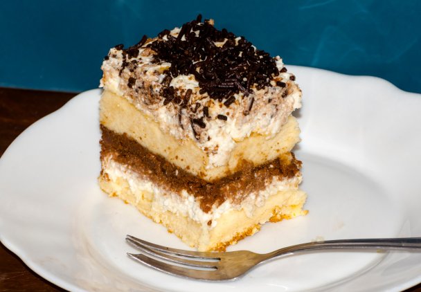 Rozprowadź połowę kremu na spodnim blacie biszkoptu. Na kremie rozprowadź przestudzoną masę karmelową. Przykryj drugim blatem biszkoptu. Rozprowadź na nim resztę kremu. Udekoruj posypką czekoladową.