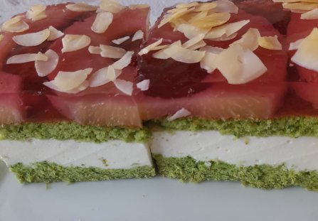 Galaretki o smaku truskawkowym rozpuścić w 3 szklankach gorącej gotowanej wody, pozostawić do zakrzepnięcia, krzepnącą wyłożyć na ciasto. Posypać płatkami migdałowymi.