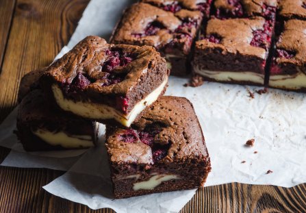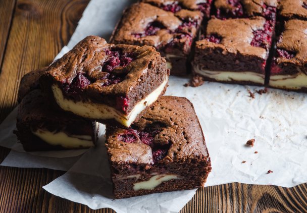 Blaszkę o wymiarach 30 x 20 cm wyściel papierem do pieczenia. Połowę ciasta czekoladowego przelej na spód blaszki, powierzchnię wyrównaj. Na ciasto czekoladowe wyłóż masę serową. Powierzchnię wyrównaj. Na górę wyłóż pozostałą część ciasta czekoladowego oraz maliny.