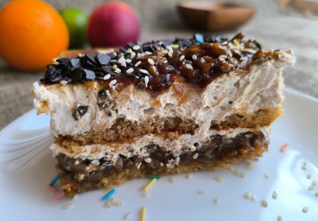 Nałóż masę ze słonecznikiem na jeden z blatów ciasta. Na masę wyłóż część kremu. Przykryj drugim blatem ciasta. Rozprowadź na nim resztę kremu. Całość oblej z wierzchu tężejąca polewą. Oprósz ją resztą dropsów czekoladowych. Możesz dodatkowo udekorować ciasto, np. odrobiną białego sezamu.