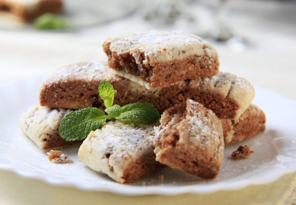 Upieczone ciasto wyjmij z piekarnika i odstaw do wystudzenia. Pokrój na prostokąty lub romby.