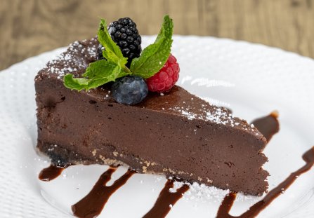 Tortownicę o średnicy 17 cm wyściel folią spożywczą. Czekolady mus przelej do formy. Ciasto wstaw do lodówki na minimum 4 godziny (najlepiej na całą noc). Kremowe ciasto czekoladowe jest gotowe do krojenia, kiedy całkowicie stężeje.