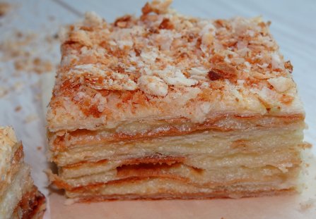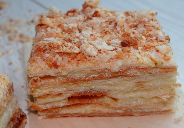 Ciasto francuskie rozwiń na blacie. Przełóż na blachę wyłożoną papierem do pieczenia. Przykryj dużą blachą, zarówno jeden, jak i drugi blat ciasta. Włóż do piekarnika rozgrzanego do 200 stopni Celsjusza i piecz przez około 15-20 minut. Wyciągnij i ostudź. Wtedy przekrój je na pół.