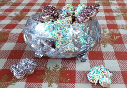 Rozwałkuj ciasto na 4-5mm wytnij ulubione kształty i przełóż na wyłożoną papierem do pieczenia blachę.