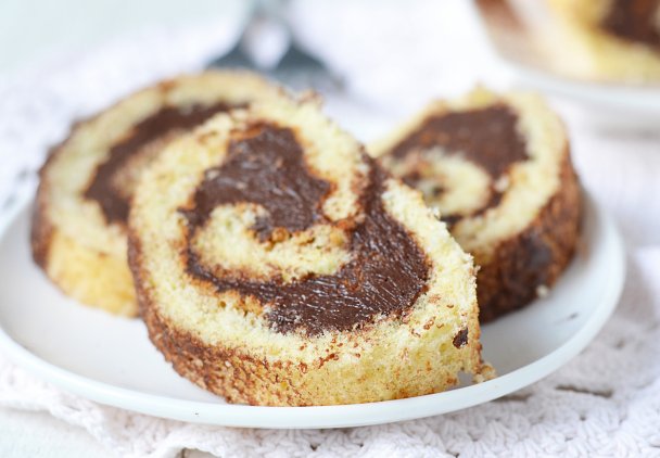 Roladę z kremem czekoladowym podawaj na zimno, posypaną kakao.