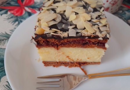 Polać polewą czekoladową ciasto. Posypać płatkami migdałowymi. Pozostawić do całkowitego wystudzenia. Smacznego.
