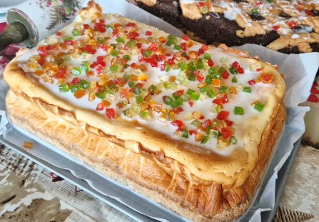 Następnego dnia polewamy sernik lukrem i przyozdabiamy świątecznie. Składniki lukru dobrze mieszamy. Cukier puder dodajemy do płynu stopniowo, aż do uzyskania masy lejącej się jak gęsty miód. Jeszcze płynny lukier posypujemy mieszanką kandyzowaną.