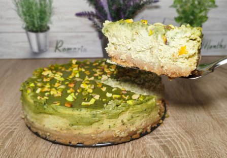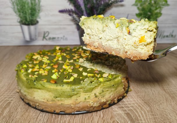 Przygotowanie polewy. W kąpieli wodnej rozpuszczamy czekoladę razem ze śmietanką oraz matchą i polewamy sernik. Na końcu posypujemy pistacjami.