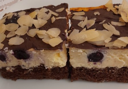 Sernik wystudzić. Czekoladę rozpuścić w kąpieli wodnej, wyłożyć na wierzch, posypać płatkami migdałowymi. Można chwilę schłodzić w lodówce. Podzielić na porcje.