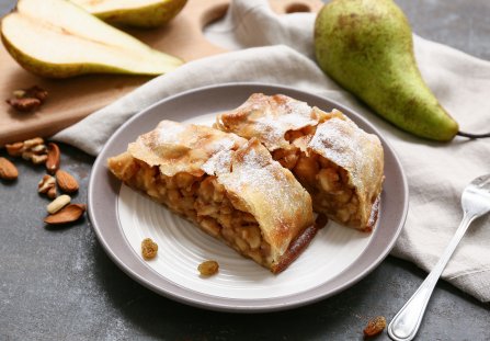 Strudel gruszkowy, czyli cieniutkie jak pergamin, delikatne ciasto nadziewane soczystymi gruszkami, chrupiącymi orzechami, wyrazistym serem gorgonzola i kremowym mascarpone. Prawdziwa poezja smaku! Idealnie zbalansowane smaki zachwycą nawet najbardziej wymagające podniebienia.