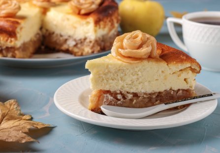 Szarlotka z warstwą sernikową to świetny kompromis pomiędzy szarlotką, a sernikiem. Wypiek pięknie prezentuje się na talerzu, a do tego niesamowicie smakuje. Kruchy spód, soczysta masa jabłkowa z cynamonem i kremowa warstwa sernikowa to prawdziwa gradka dla wszystkich łasuchów i wielbicieli tradycyjnych, polskich wypieków. Szarlotka w tym wydaniu sprawdzi się zarówno jako weekendowy wypiek jak i świąteczny deser. To ciasto na każdą okazję. Udekorowane różami z jabłek z pewnością na każdym zrobi ogromne wrażenie.