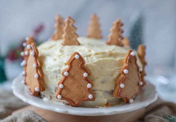 Na warstwę bakaliową wyłóż połowę masy chałwowej. Przykryj drugim blatem biszkoptu i delikatnie dociśnij. Wierzch i boki posmaruj resztą masy chałwowej. Udekoruj całość pierniczkami albo ciastkami korzennymi jak na zdjęciu.