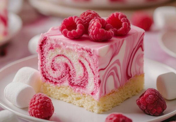 Udekoruj schłodzone ciasto świeżymi malinami i piankami marshmallows.