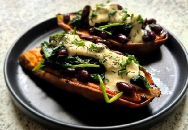Szpinak z Fasolą nałóż na połówki batatów. Polej sosem, udekoruj cebulą posyp ziołami, chili i pieprzem.