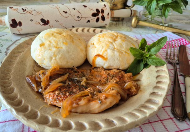Bitki ze schabu wieprzowego z cebulą to nasz ulubiony, szybki obiad. Kruche i chude mięso z podsmażoną cebulą w sosie własnym, do tego puszyste parowańce.