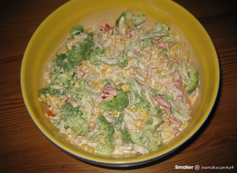 Brokuły wrzucamy na posolony wrzatek na 1-2 minutki, można oczywiście użyc świeże, jeśli mamy. Paprykę, pieczarki, cebule marynowane ***z moich przepisów*** 1 słoik litrowy, lub oczywiście w sklepie możemy kupic marynaty. Odsączone marynaty, kukurydzę z puszki mieszamy z majonezem, śmietaną, dodajemy ostudzony brokuł, doprawiamy solą i pieprzem.