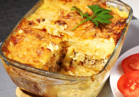 Niezwykle sycąca bułgarska zapiekanka ziemniaczana z mięsem mielonym i pomidorami. Połączenie mięsa wieprzowego, ziemniaków i soczystych pomidorów tworzy wielowarstwową kompozycję, którą spaja kremowy sos na bazie mleka i jajek. Całość aromatyzowana jest cząbrem – popularną przyprawą Bułgarii, nadającą potrawie ziołowej świeżości i autentycznego charakteru. Danie zapieczone pod złocistą pierzynką z żółtego sera idealnie sprawdza się jako rozgrzewający obiad dla całej rodziny.