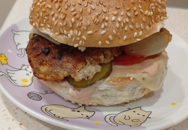 1. Przygotowujemy mięso mielone na kotlety (dodajemy cebulkę skrojoną w drobną w kostkę , jedno jajko, dwie łyżeczki bułki tartej, pieprz i sól lub gotową przyprawę do mielonego). Mieszamy, smażymy. 2. Sos czosnkowo majonezowo jogurtowy ( przez praskę przepuszczamy dwa ząbki czosnku, dodajemy łyżkę majonezu i jogurtu, szczyptę pieprzu) 3. Sosem smarujemy bułkę , kładziemy plaster sera żółtego i kotlet, można również dodać cebulkę podsmażoną na patelni ( Akurat podpiekałam w air fryer ok. 3 min, można też w prodiżu ) . 4. Po wyjęciu dodaje świeży pomidor pokrojony w plastry i ogórek.