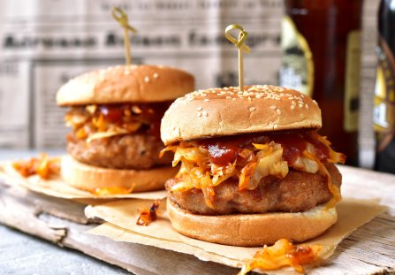 Burgery z kurczaka z karmelizowaną cebulką w niczym nie ustępują tym z wołowiną czy wieprzowiną.