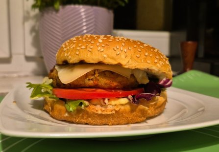 Bułki przekrój, podgrzej w piekarniku posmaruj majonezem, ułóż porcję sałaty, pomidora, kotlet i cebulę. Przykryj bułką.
