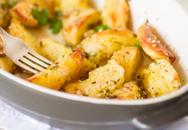 Chrupiące ziemniaczki po turecku zdejmij z ognia i podawaj na ciepło jako samodzielne danie lub dodatek do mięs.