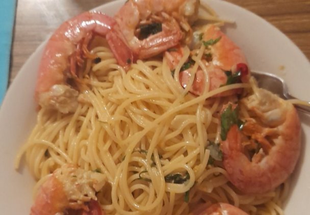 Ugotowany makaron przekładamy do krewetek , dokładnie mieszamy. Smacznego