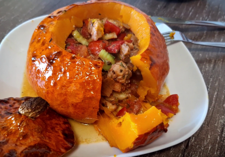 Nakładamy nadzienie do dyni (nie do samej góry — przykrywka musi dobrze przylegać).