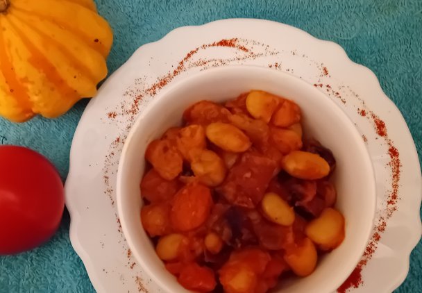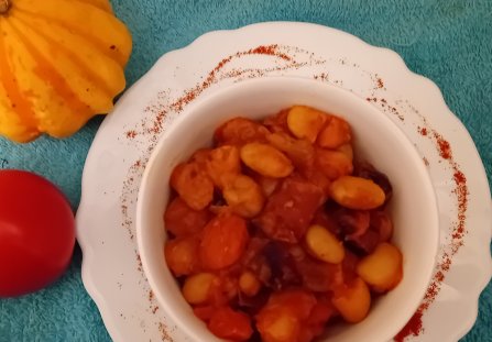 Kiełbasę i cebulę pokrój w kostkę. Podsmaż lekko kiełbasę ,dodaj cebulę. Smaż dwie minuty. Dodaj wszystko do fasoli. Jeśli danie będzie za gęste dolej wodę. Gotuj około 15 minut.