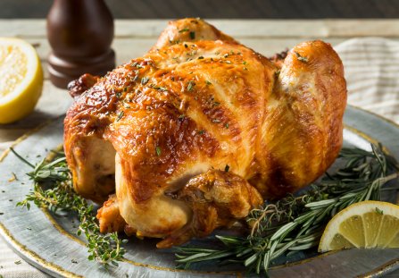 Czas pieczenia zależy od wagi kurczaka, a ten podany w przepisie jest orientacyjny. Zazwyczaj na każdy kilogram pieczonego mięsa przypada około 45-50 minut w temperaturze 180 stopni Celsjusza. Dużego kurczaka o wadze około 2 kg należy piec więc nieco dłużej. Mięso będzie gotowe, kiedy w najgrubszym miejscu przy udzie jest dobrze upieczone, a wyciekający sok jest klarowny.