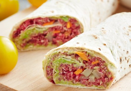 Na każdą tortillę nałóż porcję buraczkowego farszu, rozprowadź równomiernie i zwiń w rulon. Podawaj od razu.