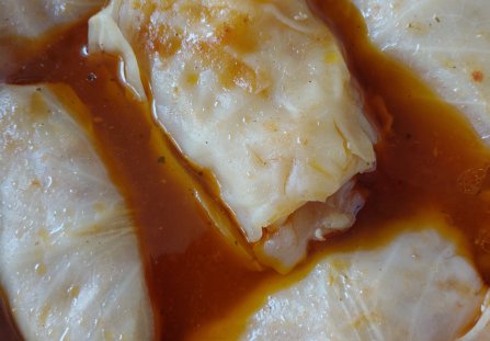 Teraz po kolei układamy po 2 liście kapusty ( większy i na niego mniejszy liść) na to duża łyżka stołowa farszu mięsnego i zawijamy. Najpierw boki liści podwinąć do środka, potem ściśle zwijamy gołąbki wzdłuż liści. Tak po kolei robimy następne gołąbki i układamy ściśle w rondlu warstwami. Każdą warstwę jeszcze przyprawiamy solą, pieprzem, wegetą i papryką w proszku. Podlać trochę wodą i wstawić do nagrzanego piekarnika 180 stopni Celsjusza. Po ok. pół godziny duszenia dolewamy wody, lub bulionu do wysokości ułożonych gołąbków. Musimy pod przykryciem ok. 1, 30 godz. Pod koniec duszenia dodać kilka łyżek przecieru pomidorowego i w razie potrzeby przyprawić. Aby sos był zawiesisty dodać trochę kaszki mannej. Podawać z ziemniakami. Z 1/2 kg przygotowanego mielonego zrobimy 12 do 14 gołąbków. Uwaga: gołąbki można zawijać w pojedyńcze liście kapusty, ale my bardzo lubimy zawijane w 2 liście.
