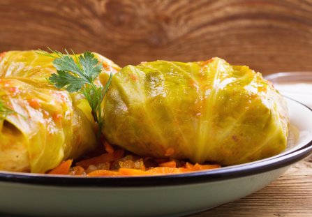 Z kapusty wytnij głąb. Włóż całą główkę do dużego garnka z wrzącą, osoloną wodą i gotuj. Gdy liście zaczną mięknąć, delikatnie je zdejmuj. Musisz otrzymać około 15−20 dużych liści.