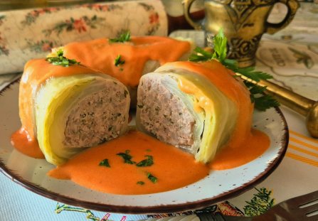 Wyjmujemy kapustę z wrzątku i po przestudzeniu rozbieramy ją z liści, odcinamy zgrubienia z każdego liścia, następnie nakładamy czubatą łyżkę nadzienia na każdy liść. Wodę z gotowania kapusty zachowujemy. Zawijamy gołąbki jak krokiety. Najpierw zakładamy liść na mięso od strony wyciętego zgrubienia, później zakładamy boki do środka, następnie zwijamy jak najciaśniej do końca.