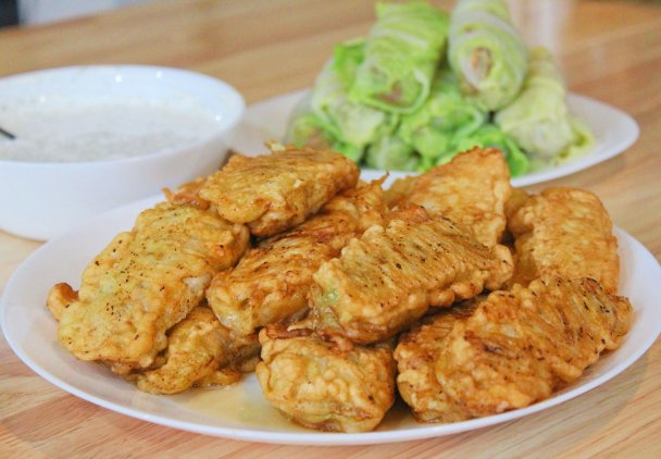Zaczniemy od przygotowania sosu jogurtowego. Do miseczki wrzucamy jogurt, koper, zioła prowansalskie, posiekany ząbek czosnku, sól i pieprz do smaku, całość mieszamy i odstawiamy w temperaturze pokojowej aby sos się przerobił. Następnie przygotujemy szybkie ciasto naleśnikowe, powinno być tylko trochę bardziej gęste. Do miski wrzucamy jaja, wlewamy mleko, mąkę, pół łyżeczki papryki ostrej mielonej i sól do smaku. Całość dokładnie mieszamy i odstawiamy w temperaturze pokojowej aby ciasto się przerobiło. Następnie, przyprawimy mięso mielone, wrzucamy mięso do większej miski, dorzucamy koncentrat pomidorowy, drobno pokrojoną cebulę paprykę i resztę posiekanego czosnku, kumin, resztę papryki ostrej mielonej, tymianek, sól i pieprz do smaku. Całość dokładnie mieszamy. Już teraz odcinamy końcówkę białej części kapusty, tak około 5-7 cm. Uwalniamy wszystkie liście i wrzucamy do gotującej i osolonej wody, parzymy aż liście zmięknie i będą idealne przy zawijaniu. Wszystkie elementy są już gotowe, tak więc możemy kompletować całą potrawę. Rozkładamy liścia na desce, następnie nakładamy odrobinę mięsa i zawijamy jak zwykłego gołąbka, gdy wszystkie gołąbki będą zawinięte, rozgrzewamy mocno patelnię, wlewamy olej, tak jak przy smażeniu kotletów mielonych, delikatnie maczamy gołąbki w cieście i układamy na rozgrzany tłuszcz. Smażymy aż ciasto ładnie się zarumieni z obu stron i gotowe :-) Gorące gołąbki spożywamy wraz z sosem jogurtowym. Zapraszam serdecznie na krótki film z przepisem i życzę Wszystkim smacznego.