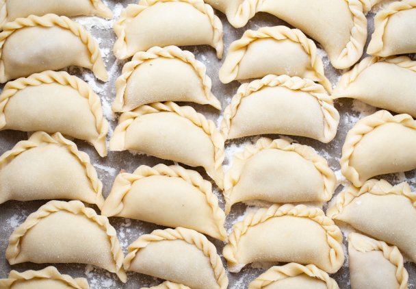Podziel ciasto na 2-3 części. Wałkuj cienko na lekko podsypanym blacie. Powinno mieć grubość nie większą niż 3 mm. Wykrawaj kółka, nakładaj farsz, zlepiaj dokładnie brzegi.