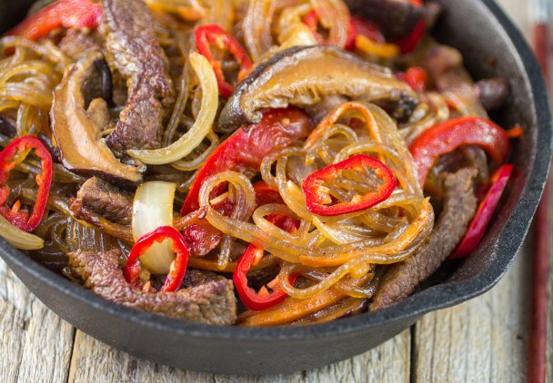 Japchae to popularne koreańskie danie, którego nazwa oznacza wymieszane warzywa. Nie ma jednak przeciwwskazań, by wzbogacić go o soczyste kawałki mięsa. Bazą dania jest przezroczysty makaron z batatów, choć można zastąpić go innym tego typu makaronem, np. ryżowym.